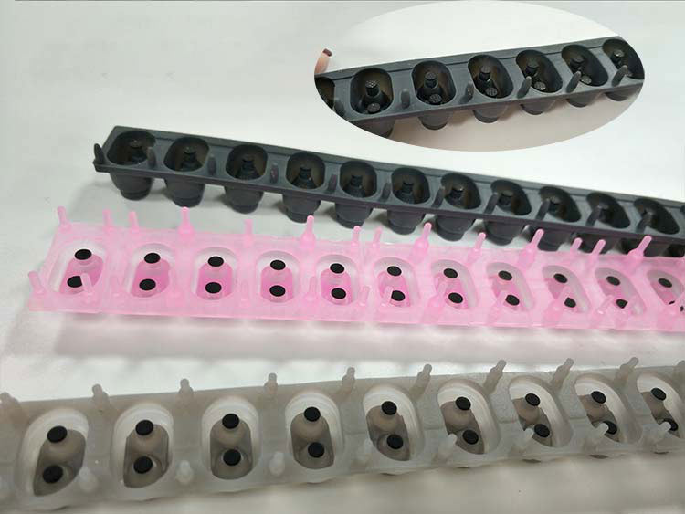對硅膠按鍵有經驗的人就知道,硅膠按鍵導電方式有很多種,比如黑粒、油墨、鍋仔片等等....而那個接觸點我們稱其為“觸點”,今天我們要講的是鋼琴硅膠按鍵,這導電膠按鍵背面有著雙觸點,這鋼琴硅膠按鍵為何雙觸點高度不一樣?雙觸點有什么作用?