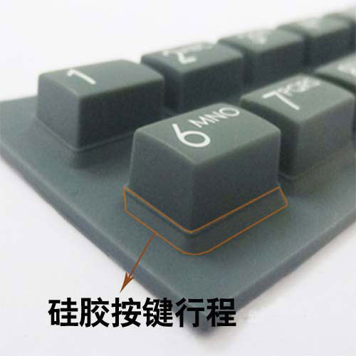 行程是指硅膠按鍵的導(dǎo)電面到PCB之間的距離,這個要靠硅膠按鍵與塑膠外殼的設(shè)計來配合,一般我們做遙控器按鍵的行程通常都做到1.1±0.1mm,這個行程能夠滿足大眾的手感要求,按鍵在按下的過程中有明顯的段落感,手感舒適,這種行程的按鍵高度一般要高出機(jī)殼1.7mm左右,即按鍵按下后表面還高出機(jī)殼0.5mm左右,這樣就能避免硅膠按鍵卡鍵或者彈不起來的問題。