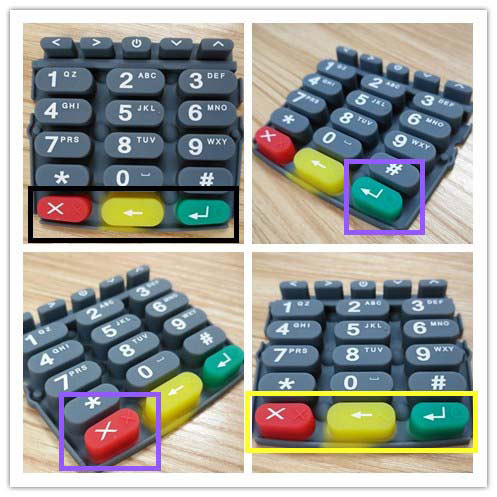 由于盲人只能靠觸覺(jué)識(shí)別,所以這些盲文都是采用刻字工藝,直接模壓一體成型。而不需要像絲印一樣再添加一道工序。不過(guò),現(xiàn)在帶有硅膠按鍵產(chǎn)品的使用人群多樣性使得按鍵表面一般是有絲印字符和凹凸盲文字符兩種。就好比博皓硅膠制品廠以前生產(chǎn)的一款POS機(jī)硅膠按鍵,如下圖: