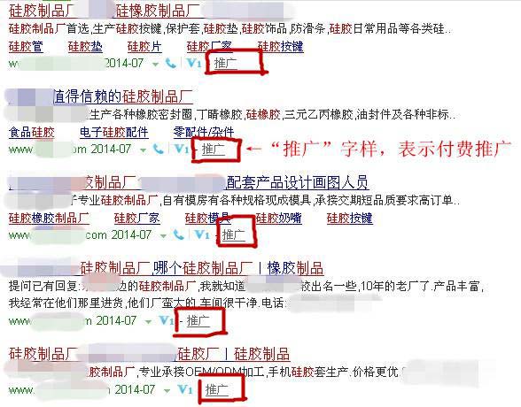 如下圖中:通過搜索“硅膠制品廠”而出現(xiàn)的鏈接里有“推廣”兩個(gè)字的,則說明這家企業(yè)是通過付費(fèi)使這條鏈接出現(xiàn)在了首頁。