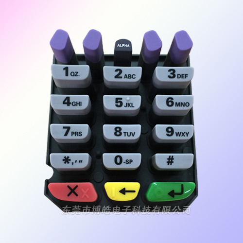 - 產品簡介:本款POS機按鍵是IC卡POS機上的硅膠按鍵,采用二次成型,表面絲印+噴涂+滴膠的工藝。博皓電子為您提供省心定制服務!